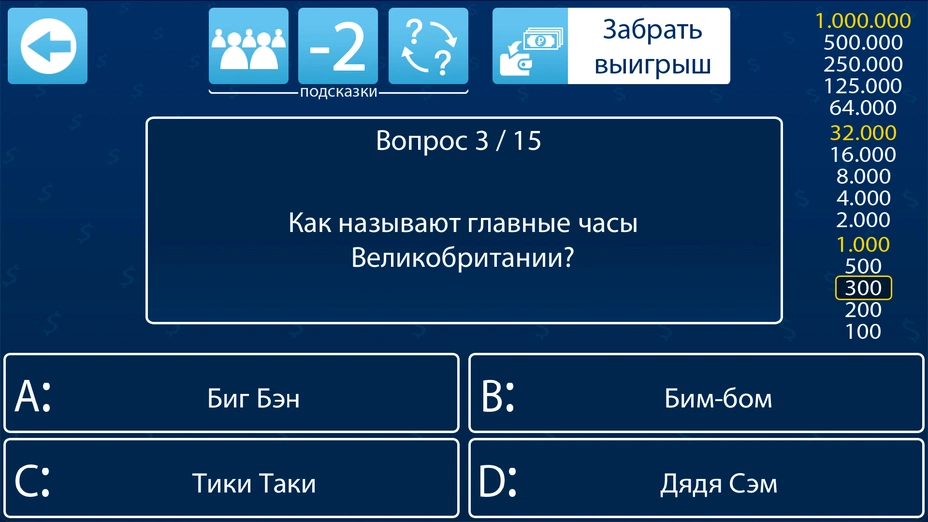 - ✅ 🛡️ Несгораемые суммы — как в настоящем шоу, у вас есть несгораемые суммы (обычно 1000 и 32000). Достигнув их, вы гарантированно уносите эти деньги, даже если ошибётесь позже.